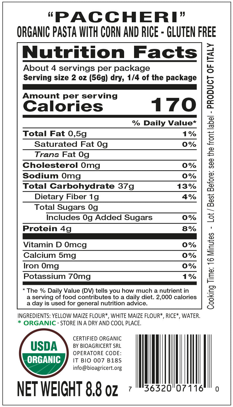 Antichi Poderi Toscani Gluten Free Organic Corn and Rice Paccheri Pasta 8.8oz/250g