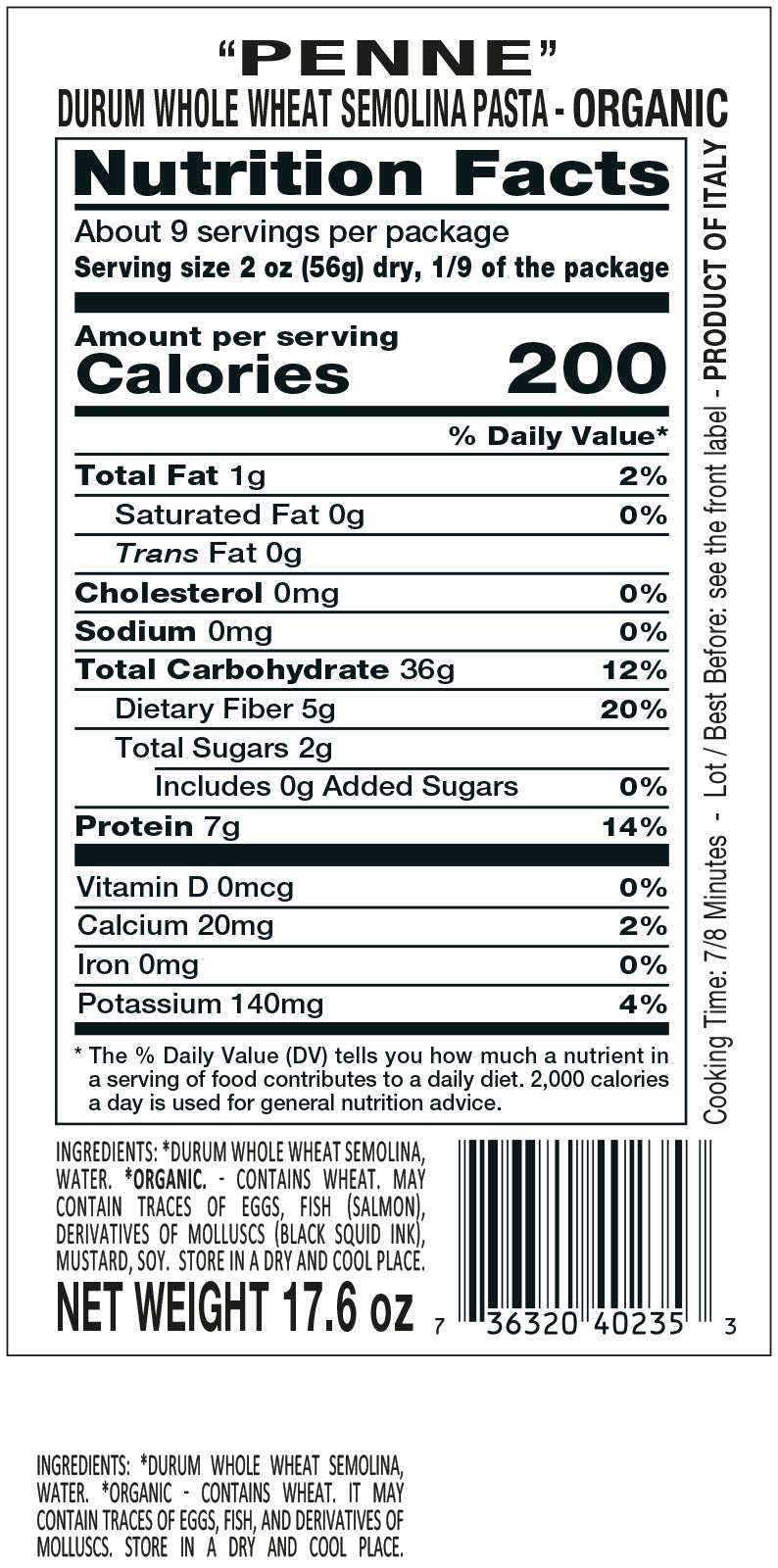 Antichi Poderi Toscani Organic Whole Wheat Penne Pasta 17.6oz/500g