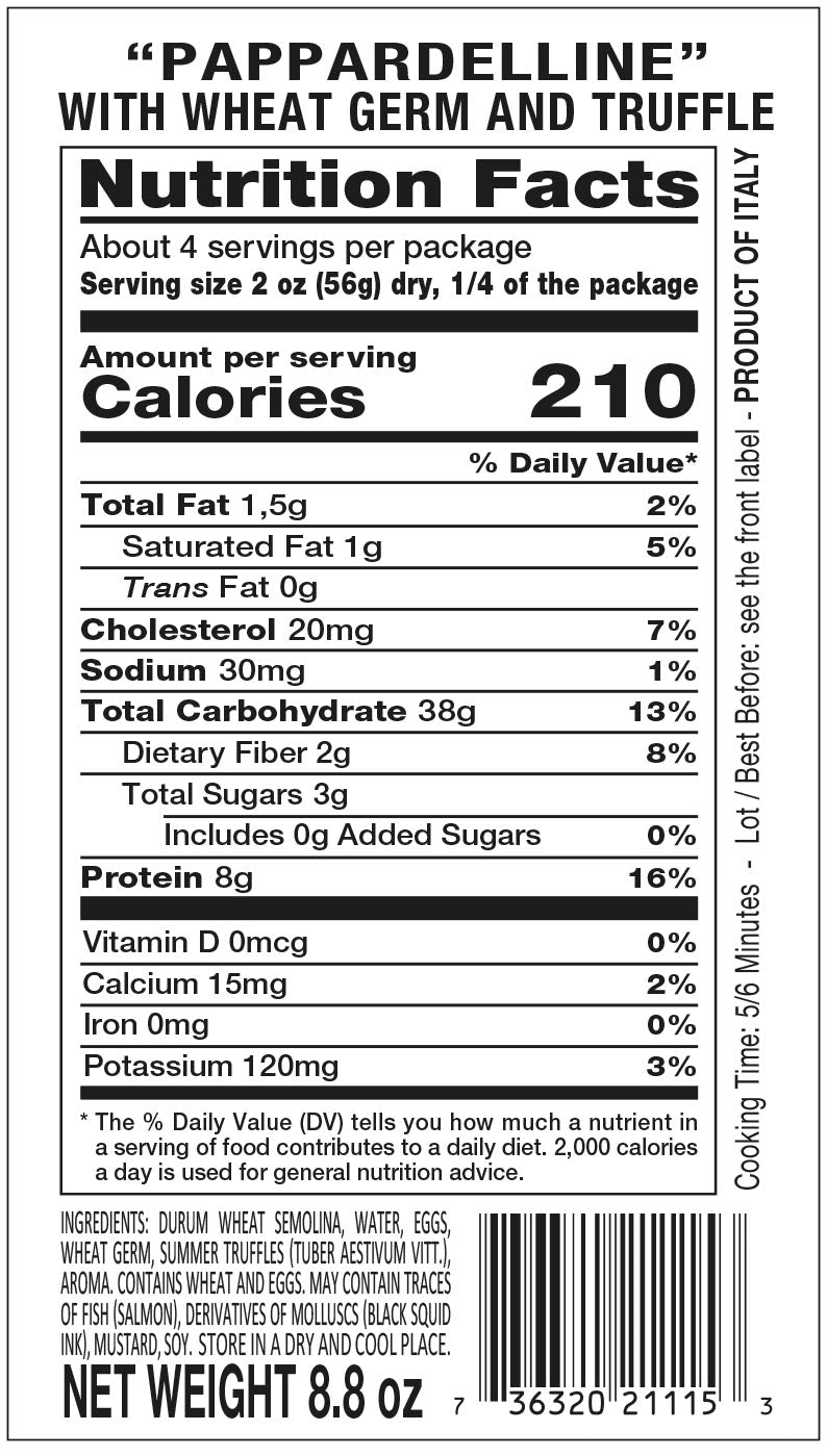 Handcrafted from premium Tuscan durum wheat semolina using time-honored artisan techniques, these pappardelline ribbons deliver an unmistakable truffle and wheat germ aroma as they cook. The distinctive fragrance pairs beautifully with truffle butter, fresh truffle, or mushroom sauces. Quick-cooking and generously portioned, each serving creates an impressive presentation on the plate—ideal for elevating simple preparations into restaurant-quality meals.